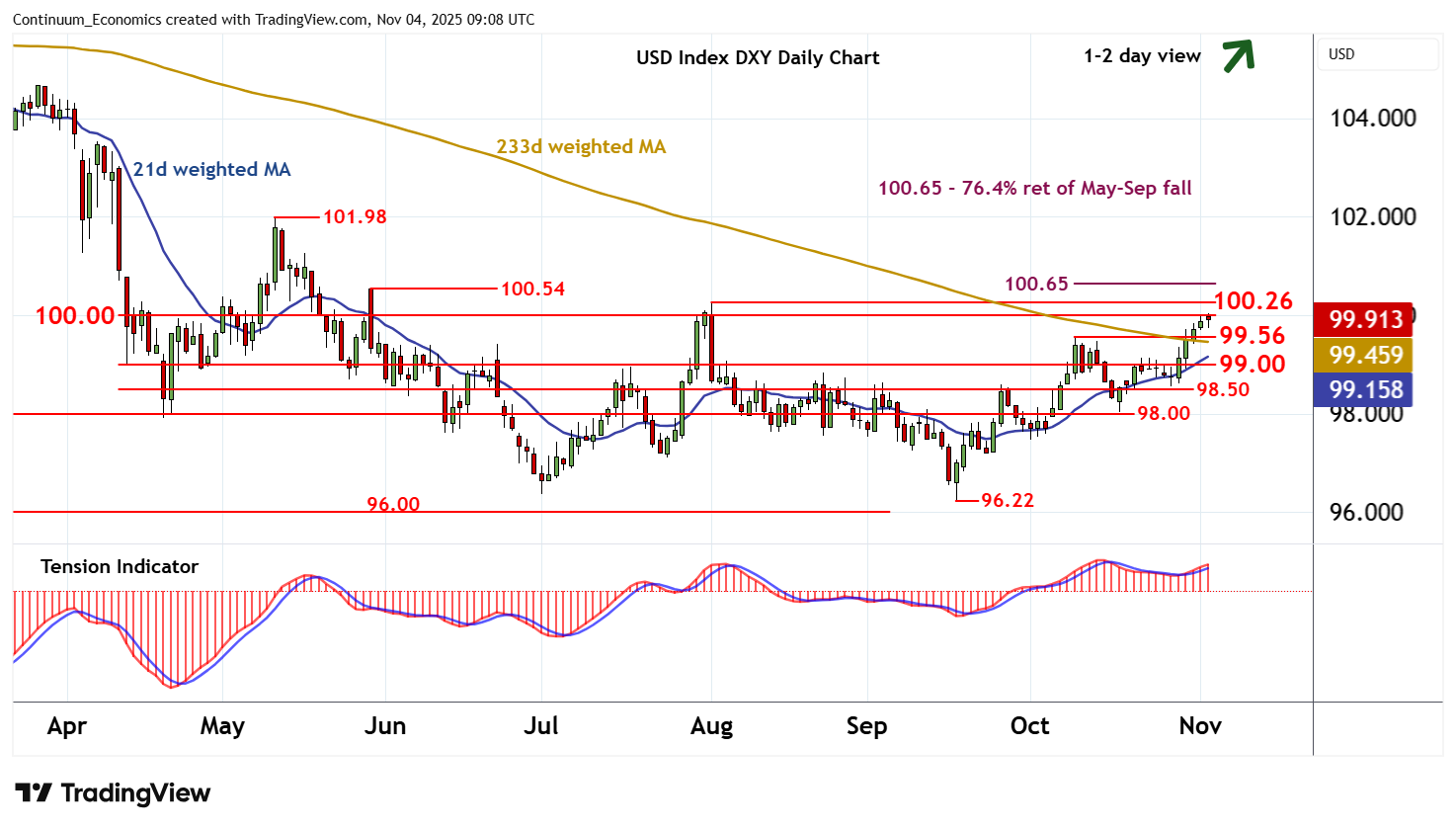 09:00 GMT - Little change, as mixed intraday studies and flattening overbought daily stochastics prompt consolidation, following the test of congestion resistance at 100.00. The daily Tension Indicator continues to rise and broader weekly charts are positive, highlighting room for further strength in the coming sessions. But a close above the 100.26 monthly high of 1 August is needed to improve sentiment and extend mid-September gains initially to the 100.54 weekly high of 29 May and the 100.65 Fibonacci retracement. However, already overbought daily stochastics could limit any initial tests of this range in profit-taking/consolidation. Meanwhile, a close back below the 99.56 weekly high of 9 October would help to stabilise price action and prompt consolidation above congestion support at 99.00.