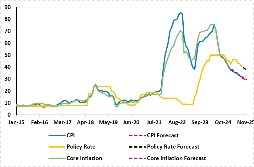 Figure 1: CPI, Core Inflation (YoY, % Change) and Policy Rate (%), January 2015 – December 2025