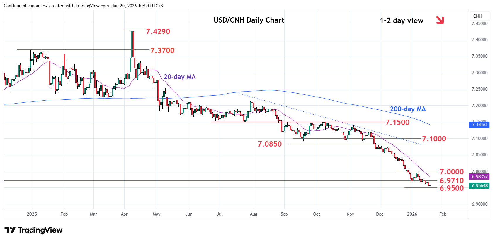 Under pressure as prices extend break of the 6.9710 2024 year low to approach the 6.9500 level