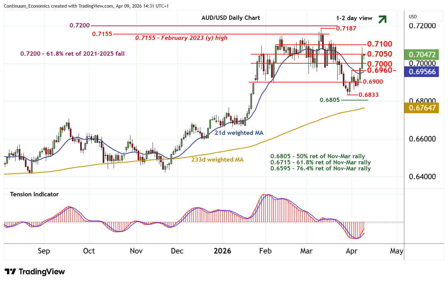 14:25 BST - Little change, as prices extend consolidation beneath congestion resistance at 0.7050. Daily readings are rising, highlighting room for continuation beyond here towards further congestion around 0.7100. But negative weekly charts should limit any immediate break above here in consolidation beneath critical resistance within the 0.7155 - 0.7187 range. Meanwhile, support remains at congestion around 0.7000 and extends to the 0.6960 weekly high of 1 April. This range should underpin any immediate setbacks.