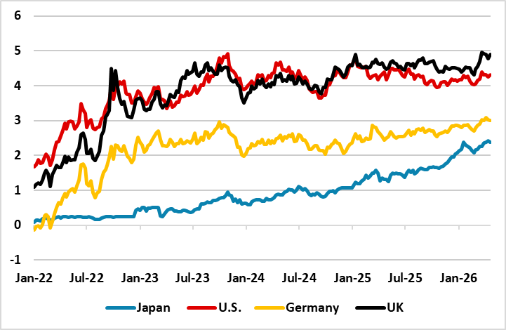 A divergence exists in major financial markets with equities extending their early April rebound (Figure 1), but government bond yields remain elevated compared to pre Iran war levels (Figure 2). Equities remain underpinned by the view that the Trump administration will be very reluctant to restart the war and will eventually compromise further to get the Straits of Hormuz reopened. Government bond markets with a shorter time horizon than equities are concerned that it is taking so long to get the Straits reopened with a standoff currently. Government bond markets are also worried that some DM central banks could tightening with 25bps BOJ & 50bps of ECB and BOE hikes discounted this year, but a flat profile from the Fed. Is this divergence a concern?