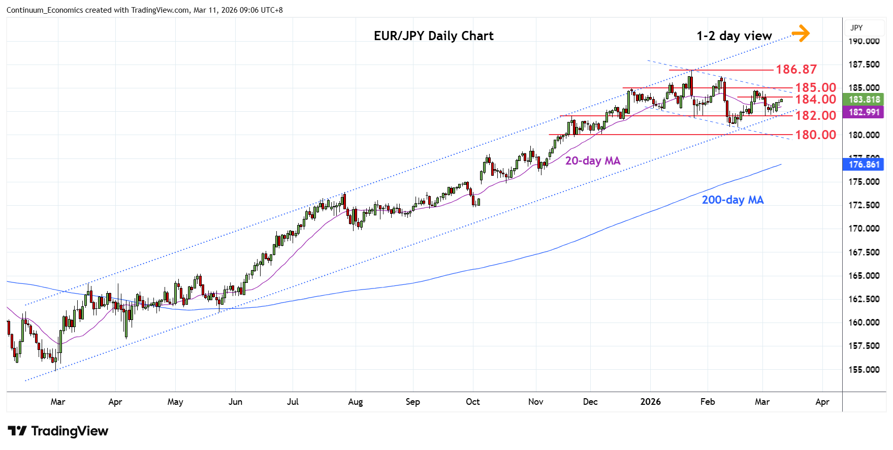 01:10 GMT - Edging higher as prices extend bounce from the 182.00 level and channel support from the February 2025 year low towards resistance at the 184.00 level and 184.78 resistance. However, gains are seen limited with channel resistance from the January high at 184.78/185.00 area expected to cap. Break, if seen, will expose the 186.23 and 186.87 February/January highs to retest. Lower high sought to further pressure the downside later and where break of 182.00 level will open up room for retest of the 180.80, February current year low. Below this will extend the broader losses from the January high to retrace rally from the February 2025 low.