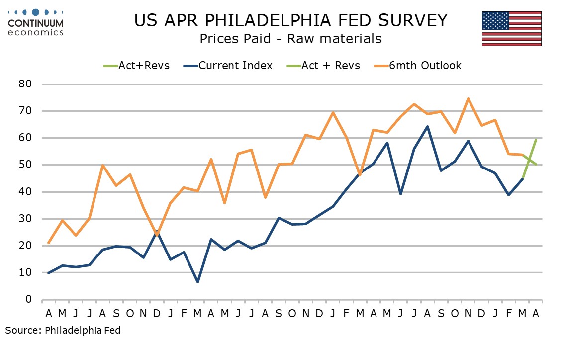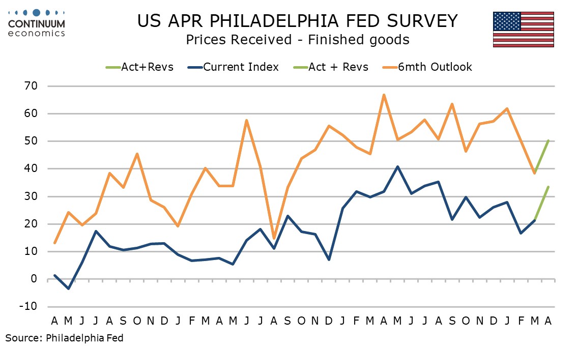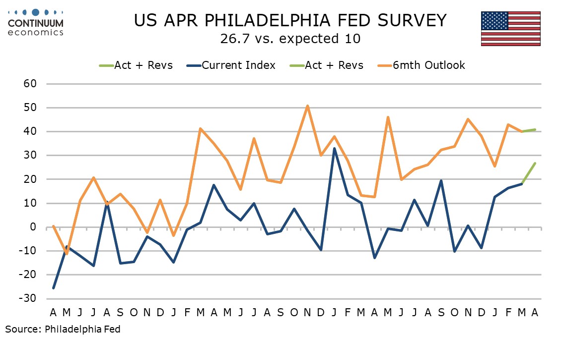 The latest US data suggests the economy so far is holding up well to the oil shock, with initial claims low at 207k from 218k and the April Philly Fed at 26.7 from 18.1, reaching its strongest since January 2025. Price data is mostly firmer, but not alarmingly so.