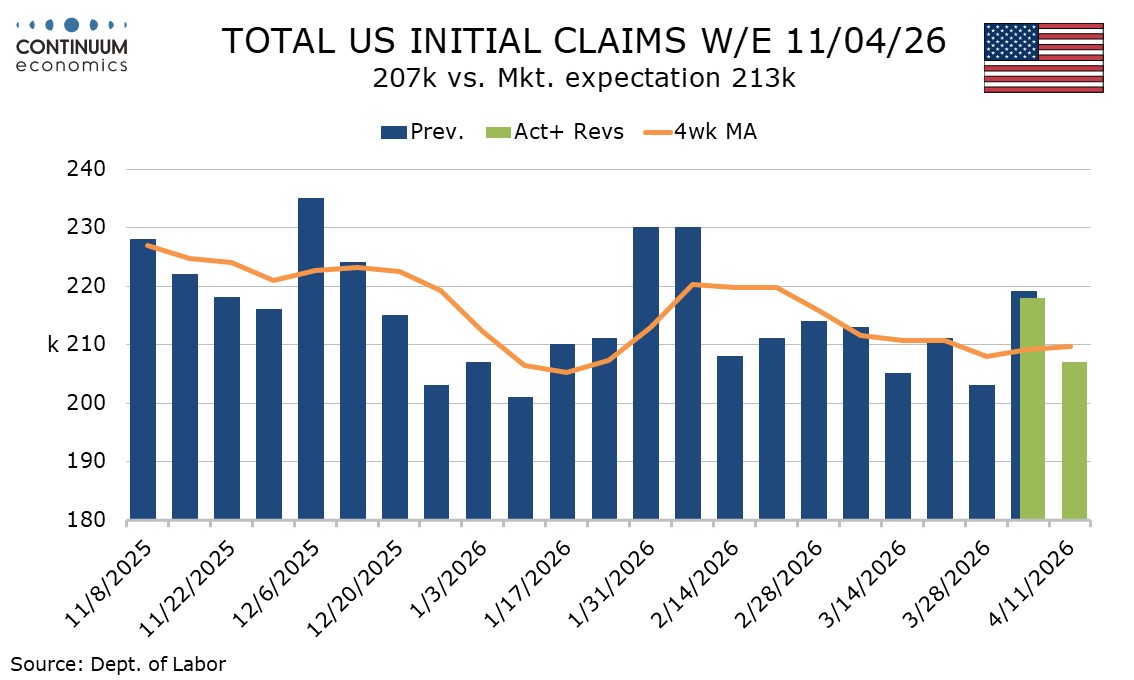 Initial claims at 207k are in line with trend, after an above trend 218k last week corrected a below trend 203k two weeks ago. The survey week for April’s non-farm payroll comes next week. Healthy signals on the labor market are consistent with improving data in the weekly ADP employment data released on Tuesday.