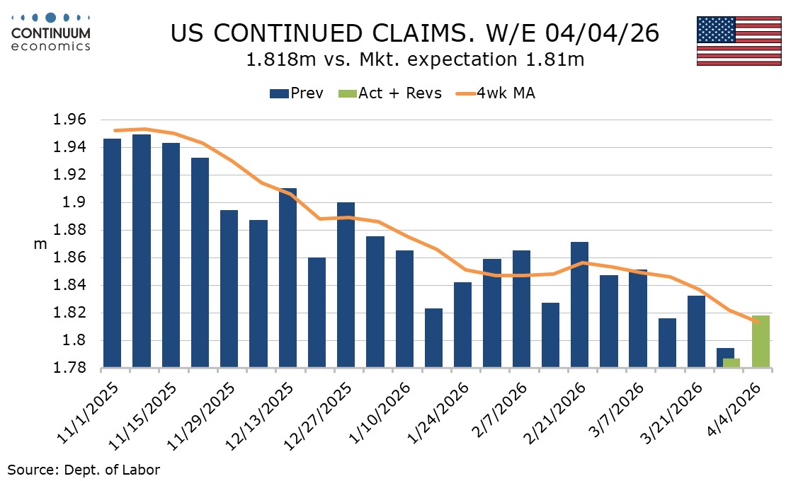 Continued claims cover the week before initial claims and like last week’s initial claims corrected from a very low preceding figure, rising by 31k to 1.818m after a preceding 45k decline. A downtrend in the 4-week average has resumed after stalling in February.