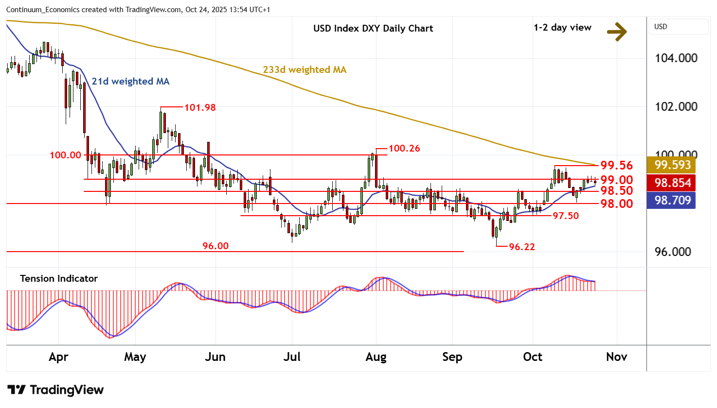 13:35 BST - Cautious trade around congestion resistance at 99.00 is giving way to a pullback, as intraday studies turn down, with prices reaching 98.75~. Both daily stochastics and the daily Tension Indicator are turning down, highlighting room for a test of congestion support at 98.50. But rising weekly charts should limit any deeper losses in renewed buying interest/consolidation above 98.00. Meanwhile, a close above 99.00 will help to improve sentiment. But a further close above stronger resistance at the 99.56 weekly high of 9 October is needed to turn sentiment positive and extend mid-September gains towards 100.00/26.