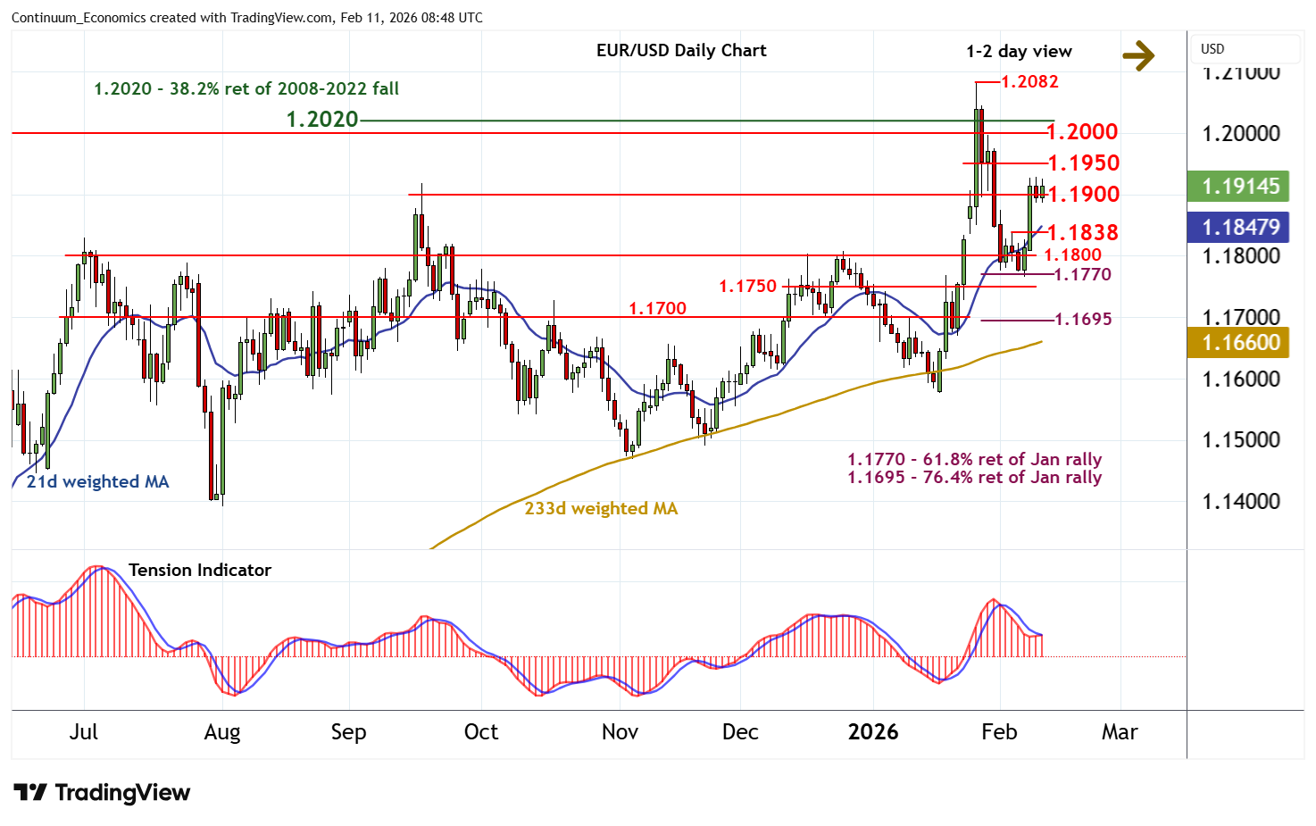 08:45 GMT - Little change, as mixed intraday studies keep near-term sentiment cautious and extend consolidation just above congestion support at 1.1900. Daily stochastics are ticking higher and the daily Tension Indicator is also edging higher, suggesting room for further gains towards 1.1950. But positive weekly studies are flattening, suggesting any break above here should meet renewed selling interest towards 1.2000 and the 1.2020 Fibonacci retracement. Meanwhile, a close back below 1.1900 will open up the 1.1838 high of 4 February, where fresh consolidation is expected to appear.
