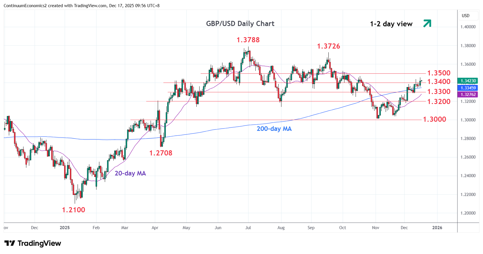 02:00 GMT - Consolidation below the 1.3400 level has given way to break to extend gains from the 1.3010, November low. Bullish momentum from the latter keeps pressure on the upside and suggest room for further gains to nearby resistance at 1.3471. Clearance here will see room for extension to strong resistance at the 1.3500/27 congestion and 1st October high where reaction can be expected. A later clearance will see room to the 1.3600 level. Meanwhile, support is raised to the 1.3400/1.3342 congestion and 12 December low which should underpin and sustain gains from the 1.3038/1.3010, November lows.