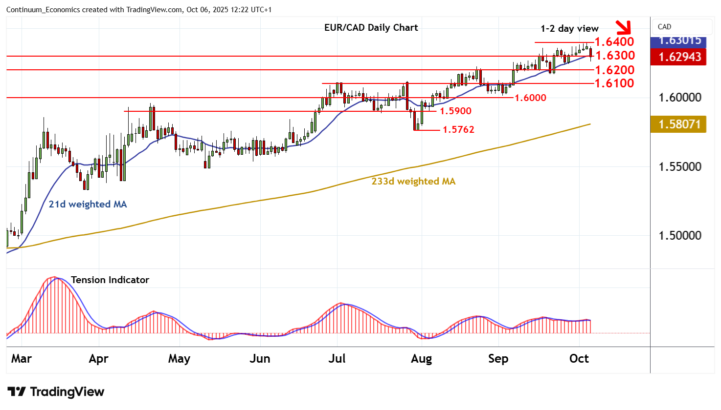12:05 BST - The fall from the 1.6400 fresh year high of 3 October has reached 1.6260, where oversold intraday studies are prompting short-term reactions. Daily readings are under pressure and broader weekly charts are mixed/negative, suggesting room for further losses in the coming sessions. A break below 1.6260 will open up congestion around 1.6200, with room for still deeper losses towards 1.6100. Meanwhile, a close above 1.6400, if seen, will turn sentiment positive and extend long-term gains towards historic congestion around 1.6500.