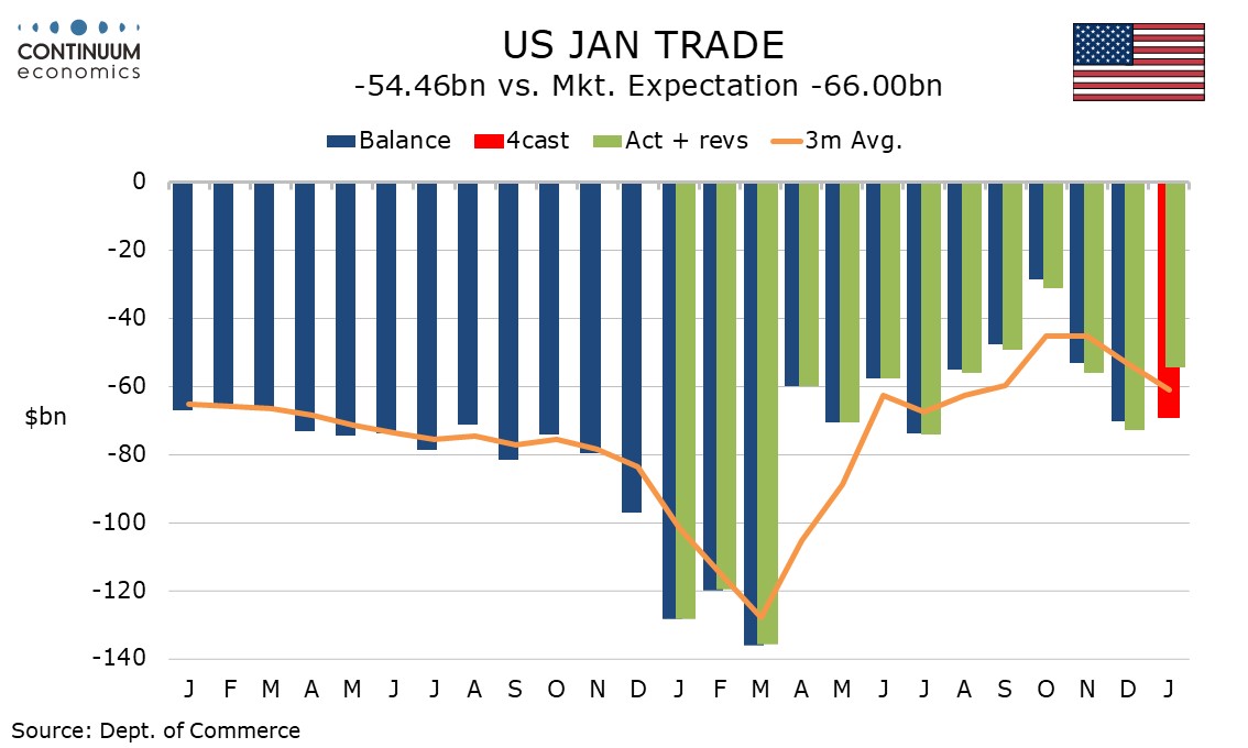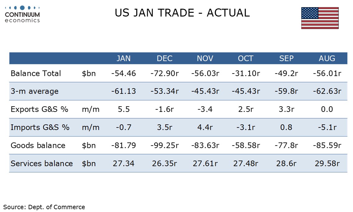 A significantly narrower US trade deficit on January of $54.5bn from $72.9bn is positive for Q1 GDP and led by a rise in exports, though the large swings in the deficit remain led by a few volatile items and trend is unclear. Initial claims at 213k from 214k remain low while January housing data is mixed, with a 7.2% rise in starts but a 5.4% fall in permits.