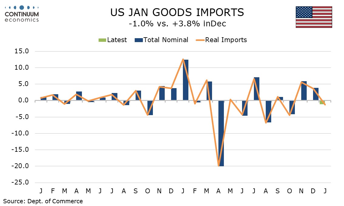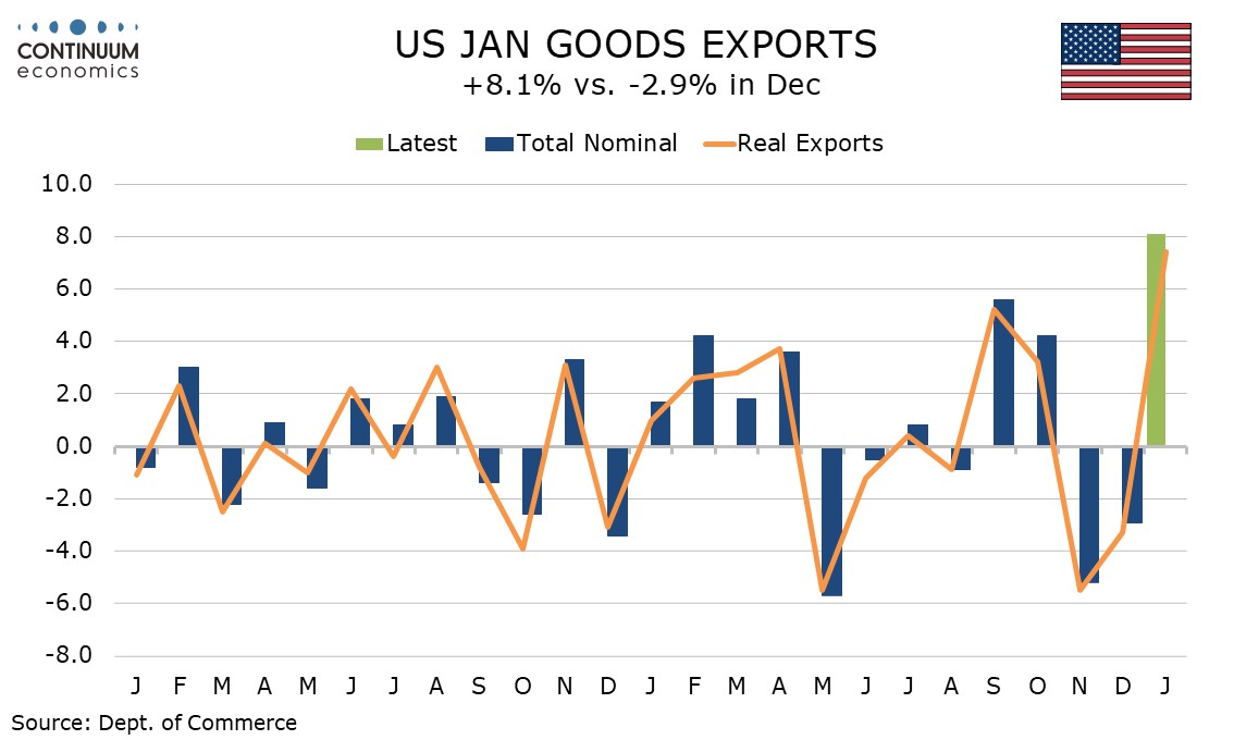 Exports increased by $14.6bn with nonmonetary gold up by $4.7bn and other precious metals up by $4.1bn, together explaining 60% of the increase. These components, particularly the former, have been very volatile recently, surging in October before slipping back in November and December. January’s strength brings the series back to what look like unsustainably high levels.