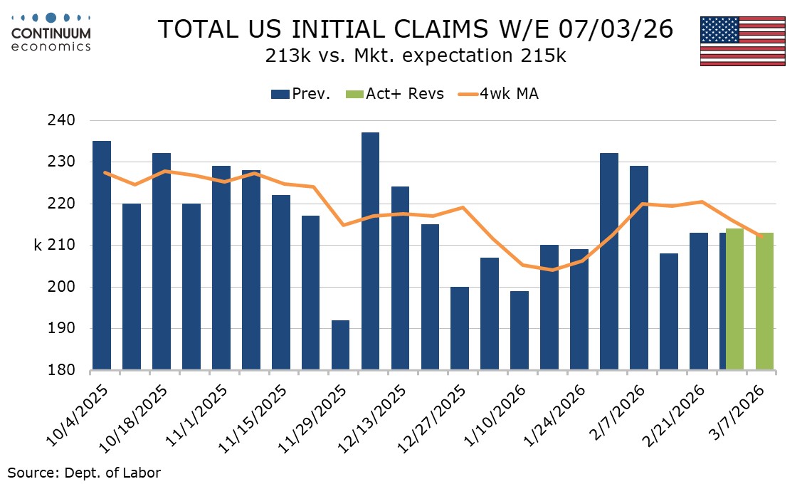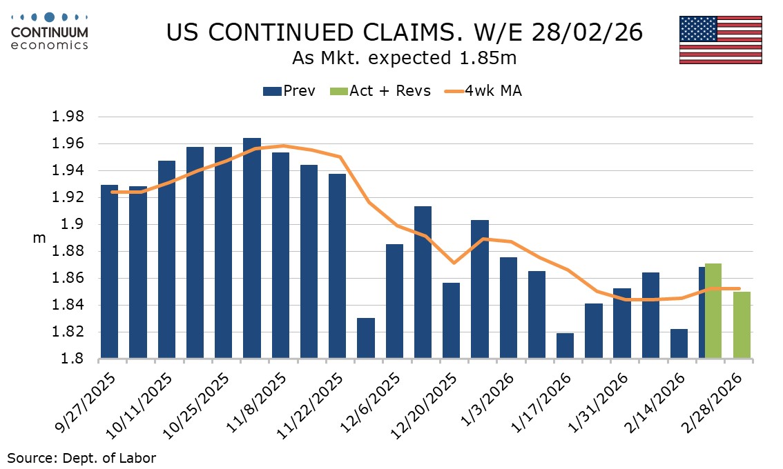 This suggests March’s non-farm payroll is unlikely to be as weak as February’s, which corrected an above trend January. Continued claims were also in line with expectations, down by 21k to 1.85m, and trend there appears to be stabilizing at lower levels than seen in late 2025.