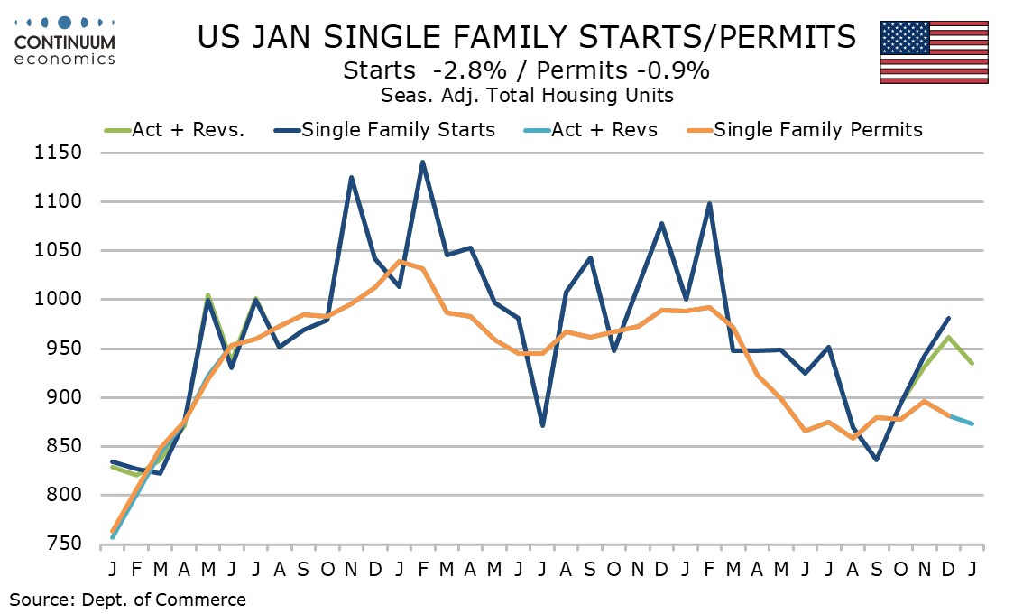 Permits fell by 5.4% to 1.376m, with a second straight decline in singles, by 0.9%, while multiples fell by 12.4% after a 16.7% December increase. Overall the housing sector has no clear trend, but January’s data on singles is consistent with survey evidence suggesting a modest loss of momentum.