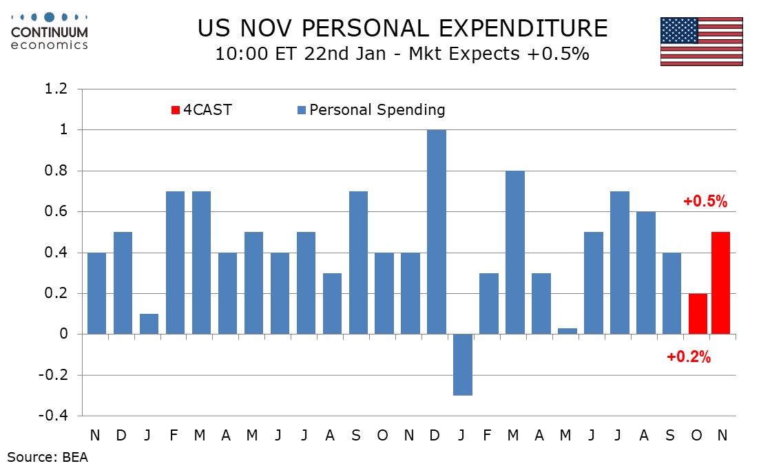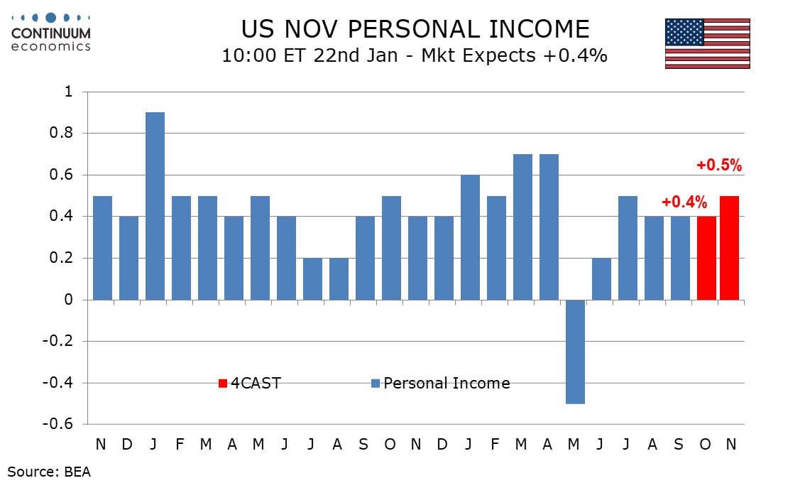 January 22 will see a personal income and spending report for both October and November. We expect personal income to rise by 0.4% in October and 0.5% in November and personal spending to rise by 0.2% in October and 0.5% in November. For core PCE prices, we expect gains of 0.2% in October and 0.1% in November. For Q4, gains slightly above 2.0% for real disposable income, real personal spending and core PCE prices all look likely.