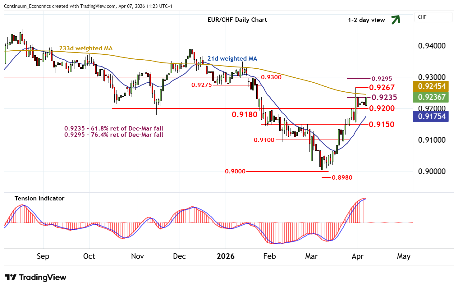 11:05 BST - Little change, as prices extend consolidation within the 0.9200 - 0.9235 range. Rising intraday studies highlight room for a break above the 0.9235 Fibonacci retracement. But negative daily stochastics and the flattening daily Tension Indicator should limit initial scope in renewed selling interest beneath the 0.9267 monthly high of 31 March. Broader weekly charts continue to rise, however, pointing to room for a later break above here and continuation of March gains towards congestion within the 0.9275 - 0.9595/00 range. Meanwhile, support remains at 0.9100 and extends to 0.9180. A close beneath here, if seen, will open up support at the 0.9150 break level, where renewed buying interest is expected to appear.