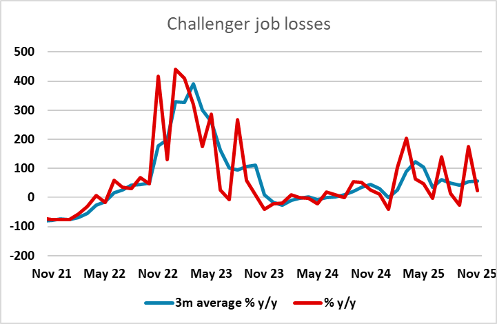 Challenger job cuts were down in November after the October spike, but the trend does look to be rising gently, with the 3 month average at 57% y/y. The market will look to the claims data as the next indication for the labour market, but after the ADP and the Challenger data the impression is of mild weakening in employment which should maintain modest downward pressure on the USD.