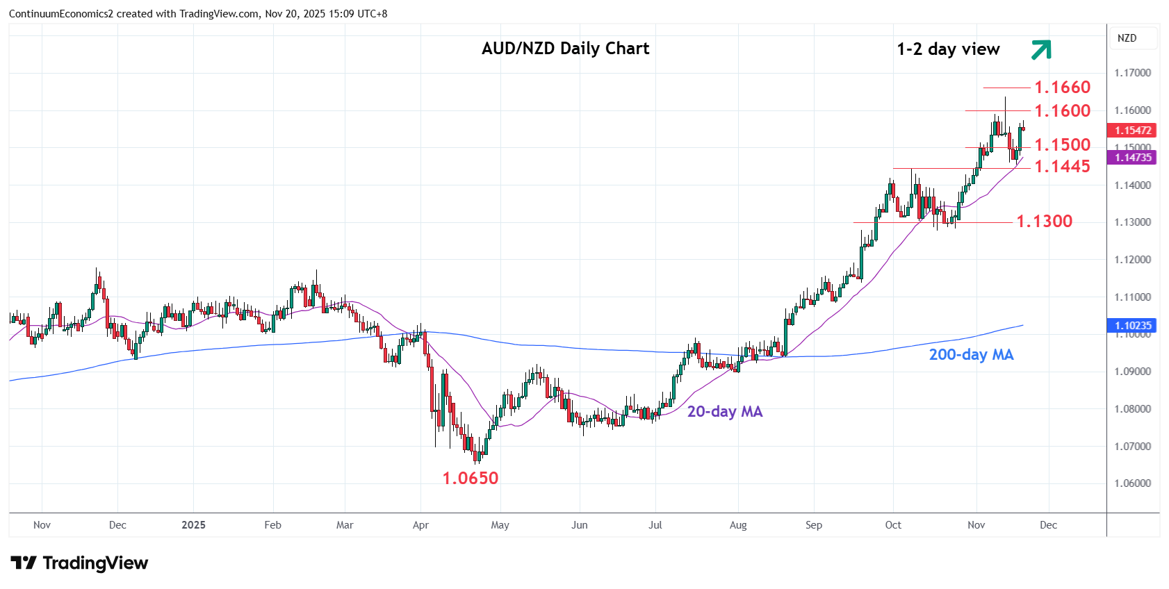07:30 GMT - Bounce from above the 1.1445 support retracing rejection from the 1.1636 current year high. Positive daily studies keep pressure on the upside and see room for retest of the 1.1600/36 resistance. Reaction at the latter is expected as daily studies remains stretched and suggest scope to extend consolidation here. Break will further extend bullish gains from April low and see room to 1.1660 and 1.1750 resistance. Would take break of the 1.1500/1.1445 support to open up room for deeper pullback to retrace the April/October rally.