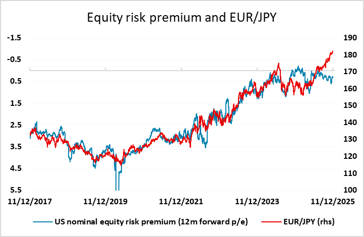 The S&P500 made another new all time high in the US yesterday, helping to drive the JPY lower and the commodity currencies higher, with EUR/JPY also hitting a new all time high and extending gains in Asia. The S&P gains came in spite of weakness in the NASDAQ due to the decline in Oracle shares after the latest forecasts. While strength in equities will tend to support the riskier currencies and undermine the JPY, it’s hard to justify the latest strength given the extreme valuations. In any case, it is not sustainable for EUR/JPY to rise with equities indefinitely. The previous relationship which held for much of the last 8 years with equity risk premia also has little fundamental justification, but is more sustainable. But on that basis, EUR/JPY should be significantly lower already.