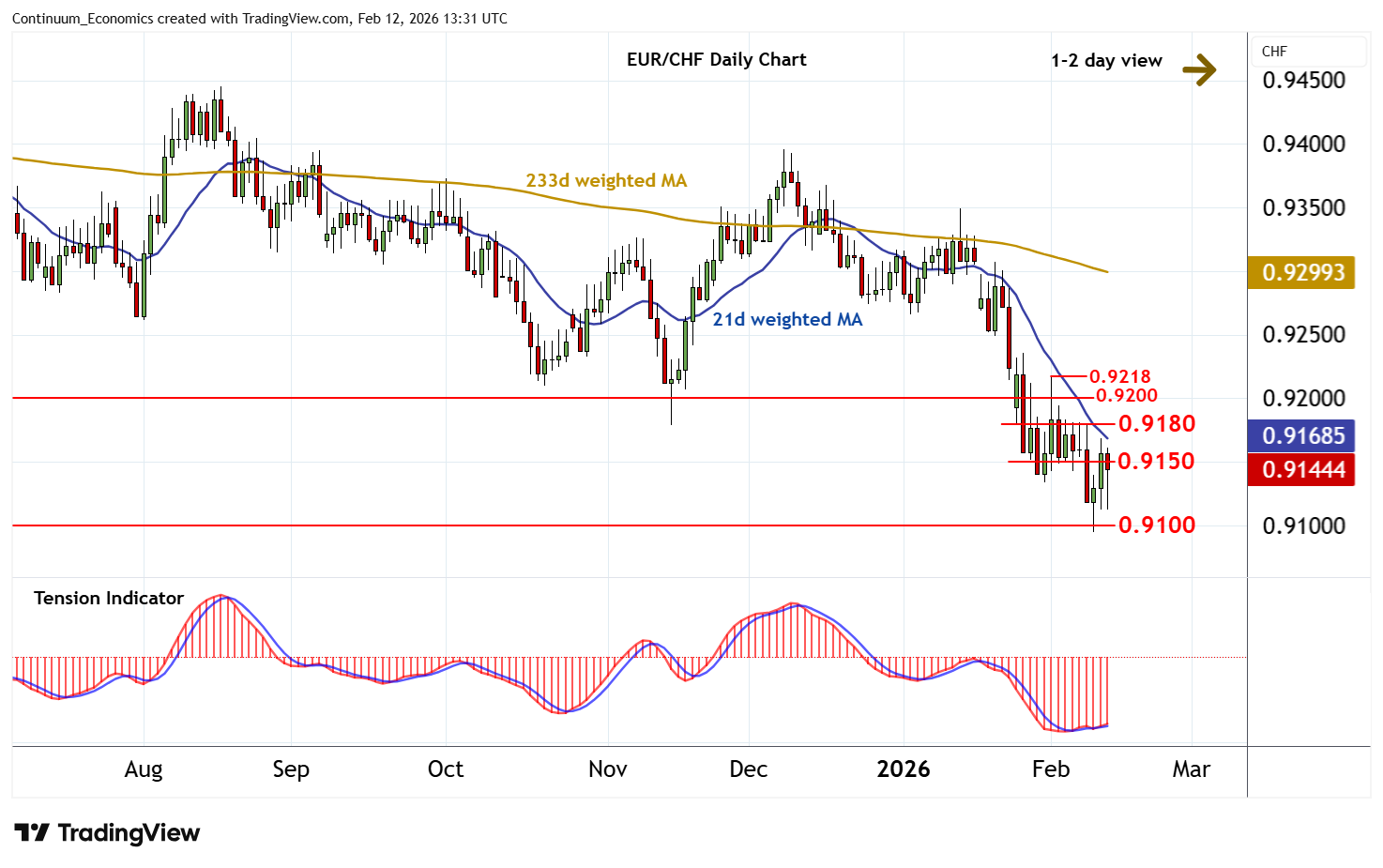 13:00 GMT - The anticipated test above resistance at 0.9150 has met selling interest beneath 0.9180/00, as overbought intraday studies unwind, with prices currently balanced around 0.9140. Daily stochastics and the daily Tension Indicator have turned higher, suggesting room for a retest above 0.9150. But negative weekly charts should prompt renewed selling interest towards 0.9180/00. Following cautious/corrective trade, fresh losses are looked for. However, a close below 0.9100 is needed to add weight to sentiment and extend losses to fresh lows towards 0.9000.