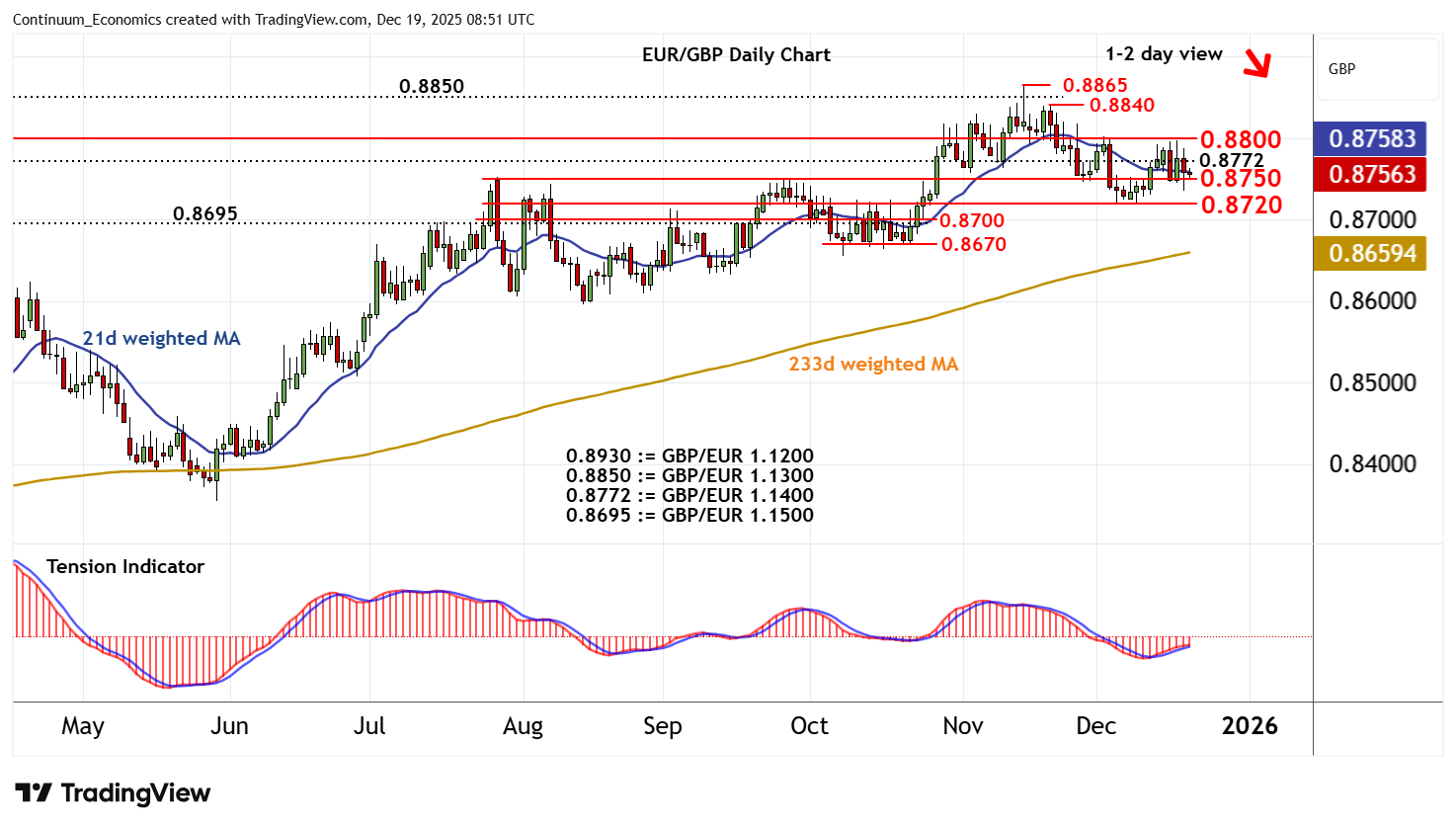 08:40 GMT - The anticipated break below 0.8772, (GBP/EUR 1.1400), has reached congestion around 0.8750, where mixed/negative intraday studies are prompting short-term reactions. A test beneath here will open up further congestion around 0.8720. But mixed daily readings are expected to limit any initial tests in consolidation, before deteriorating weekly charts prompt further losses. A close beneath here will add weight to sentiment and extend November losses towards strong support within the 0.8670 October range lows and 0. 0.8695/00. Meanwhile, any fresh tests above 0.8772 should meet selling interest towards the 0.8800 break level.