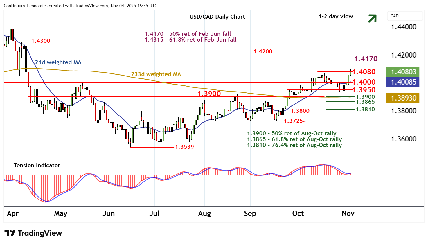 16:35 GMT - The retest of strong resistance at the 1.4080 weekly high of 14 October has reached 1.4195~, where flat overbought intraday studies are prompting a pullback into renewed consolidation around 1.4080. Daily readings continue to rise and broader weekly charts are mixed/positive, highlighting room for further strength in the coming sessions. A close above 1.4080 will improve price action and extend mid-June gains towards strong resistance at the 1.4170 Fibonacci retracement and congestion around 1.4200. However, already overbought weekly stochastics are expected to limit any initial tests in consolidation. Meanwhile, support remains at the 1.4000 break level, and should underpin any immediate setbacks.