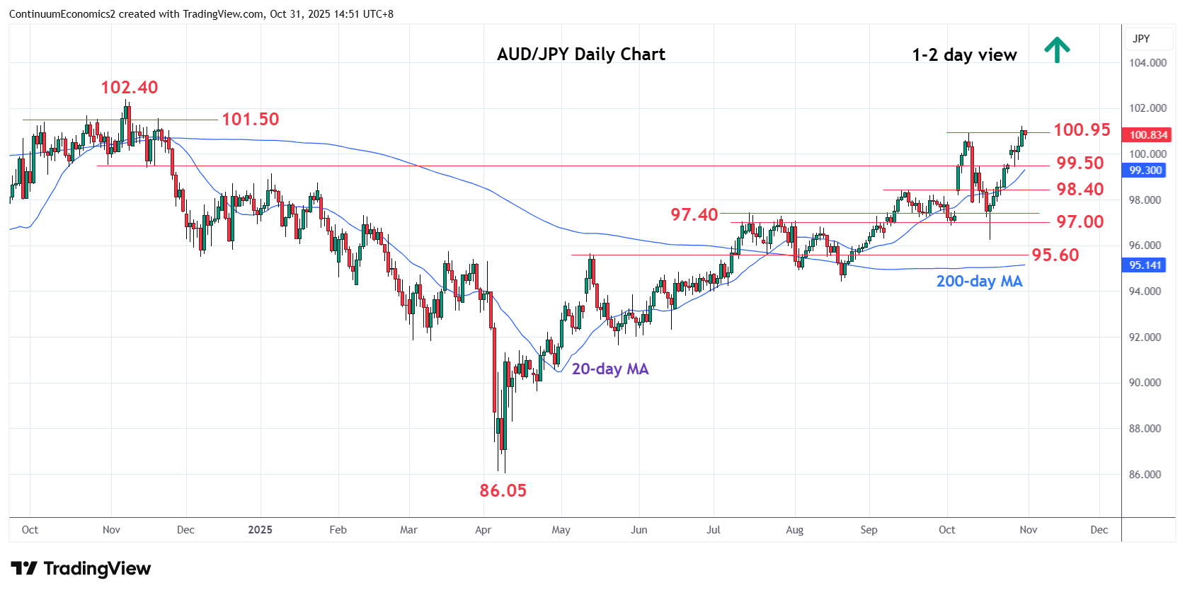 07:00 GMT - Saw break to fresh year high at 101.20 before settling into consolidation at the 101.00 level as prices unwind overbought intraday studies. Daily studies are still tracking higher and suggest potential to further extend gains from the April low. Higher will see room to the 101.50 resistance and 102.40, November 2024 high. Would expect reaction at the latter as daily studies stretched into overbought areas. Meanwhile, support is at the 100.00/99.50 congestion area. Would take break here to fade the upside pressure and see deeper pullback to 98.42 and 97.40, September/July highs.