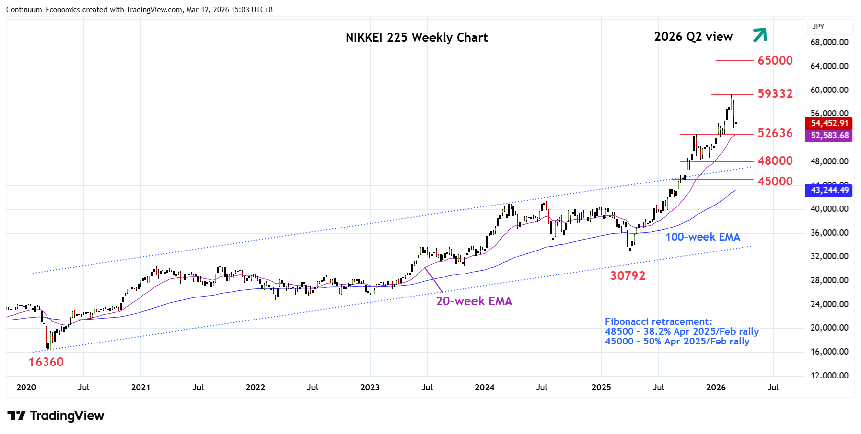 Subsequent pullback to unwind overbought weekly studies has seen drop to retest the 52636 level. Would take close below here to open up room for deeper pullback, to correct strong gains from the April 2025 year low to support at the 48500/48000, 38.2% Fibonacci retracement and congestion area. Break below this, if seen, will open up room for deeper correction to the 45000, 50% Fibonacci level.