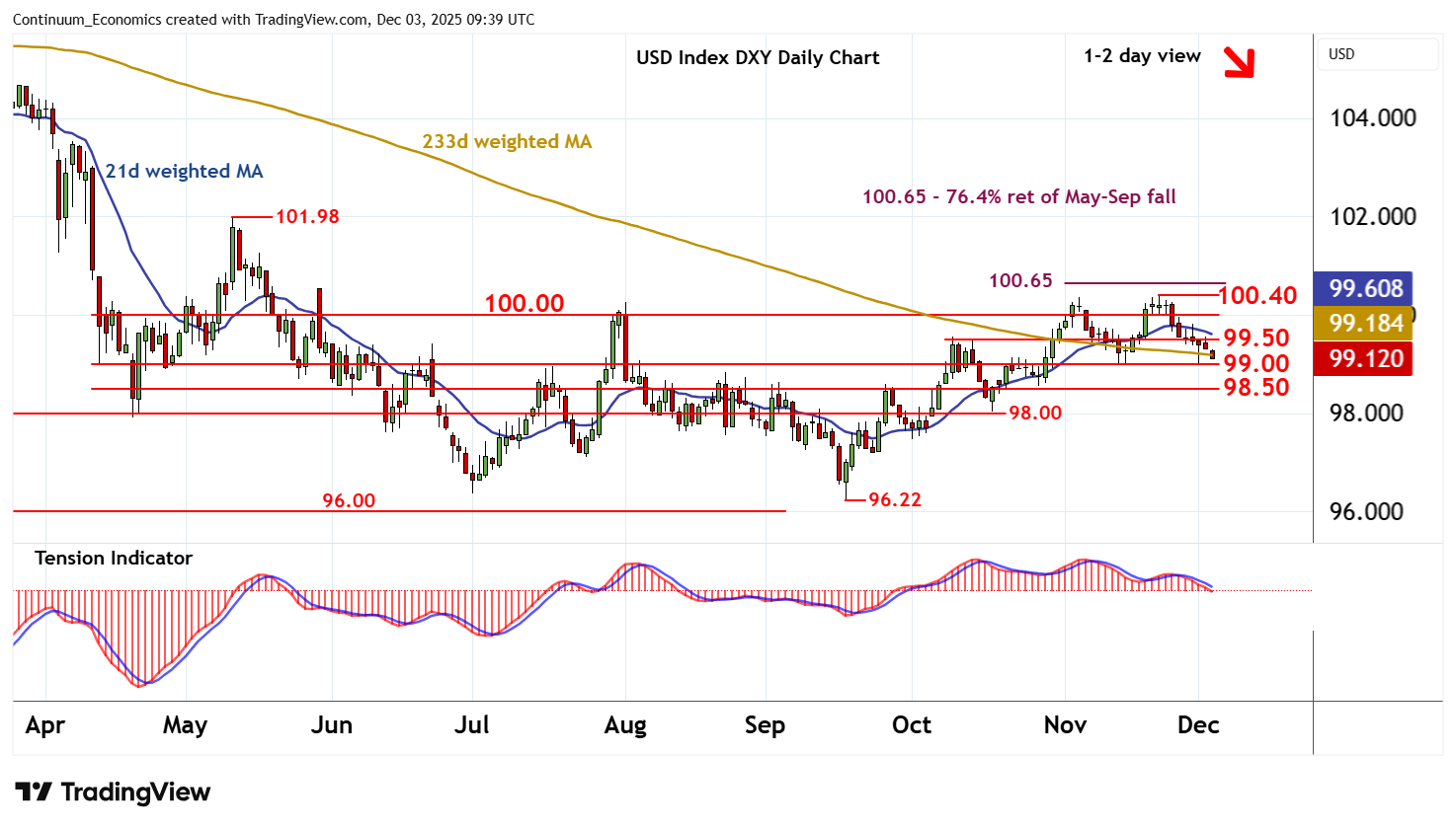 09:15 GMT - Choppy trade beneath resistance at the 99.50 break level is giving way to selling interest, as intraday studies turn down, with focus on congestion support at 99.00. Daily readings are bearish and overbought weekly stochastics are unwinding, highlighting room for a break and continuation of late-November losses towards further congestion around 98.50. Meanwhile, a close back above 99.50, not seen, would help to stabilise price action and prompt consolidation beneath congestion around 100.00