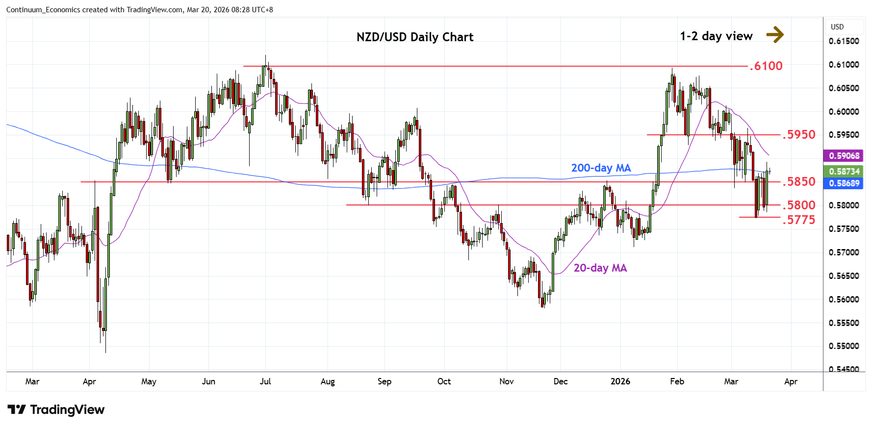 Higher in consolidation from the .5775 Fibonacci level and break above the 200-day MA at .5870 opens up room for stronger gains
