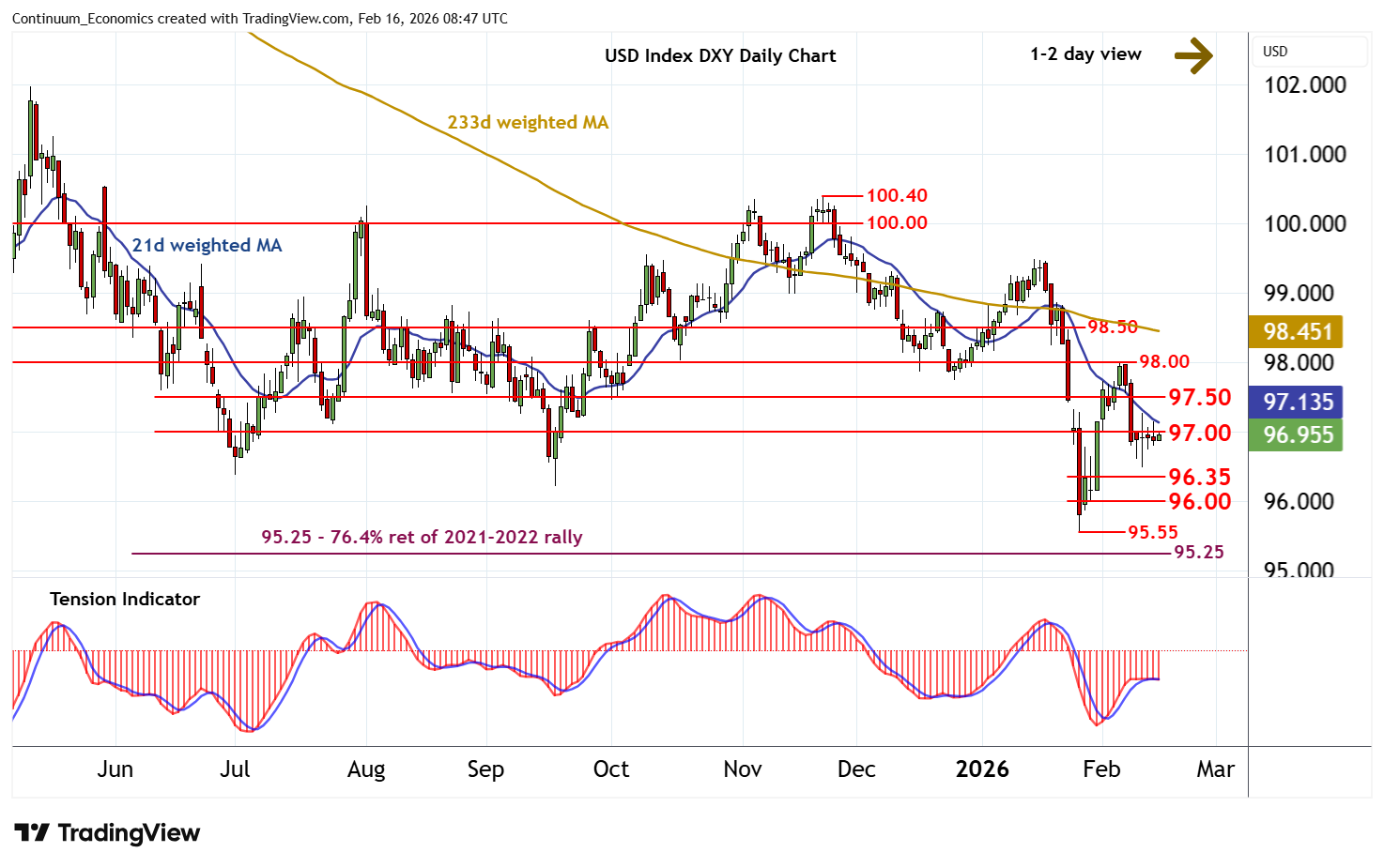 08:40 GMT - Still little change, as prices extend cautious trade around congestion resistance at 97.00. Intraday studies are mixed/positive, highlighting potential for a test above here. But mixed daily readings and negative weekly charts should limit scope in renewed selling interest beneath further congestion around 97.50. Following cautious trade, fresh losses are looked for. Support is down to congestion around 96.35. A later break will open up congestion around 96.00.