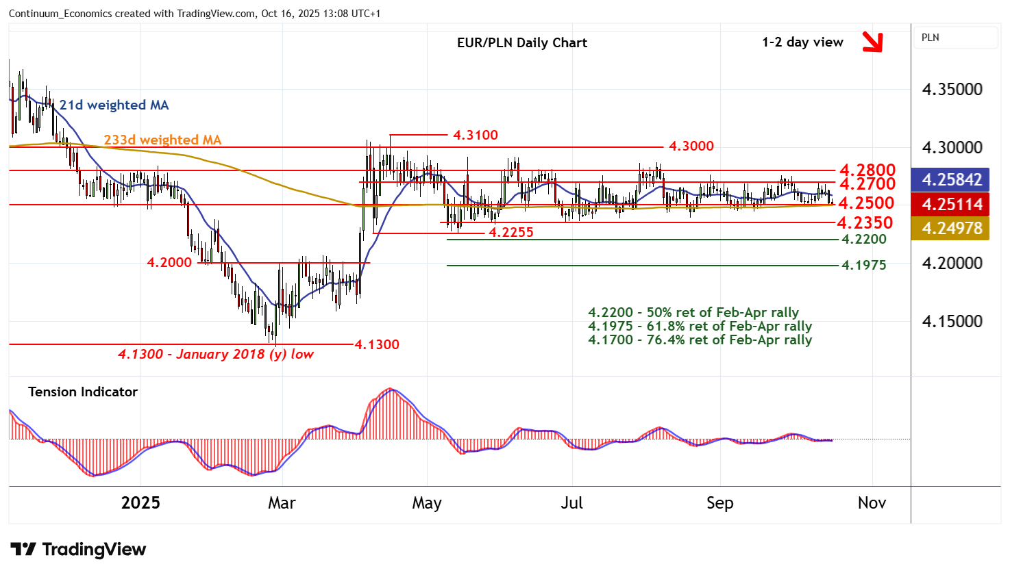 12:50 BST - The anticipated test above resistance at 4.2700 has not been seen, as daily studies turn down once again and prompt a test of congestion support at 4.2500. Broader weekly charts are also under pressure, pointing to room for a break towards further congestion around 4.2350. But already oversold daily stochastics are expected to limit any initial tests in renewed consolidation. A close below critical support within 4.2200/55 would complete a multi-month distribution pattern beneath 4.2800 and extend April losses towards 4.1975/00. Meanwhile, resistance remains at 4.2700 and should cap any immediate tests higher.