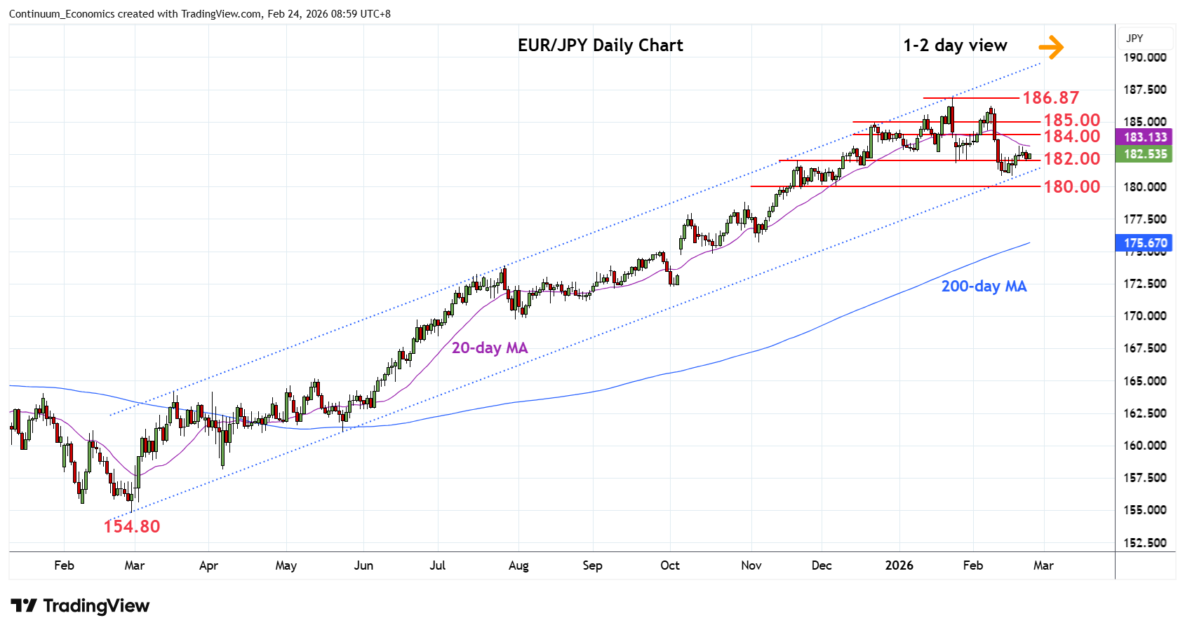 01:10 GMT - Lower in range from the 183.15 high of last week to consolidate at the 182.00 level. Consolidation here is expected to give way to break later to focus to the downside for retest of the 180.80 low and channel support. Break here will see deeper pullback to retrace rally from the February 2025 year low and see room to strong support at 180.00 figure. Meanwhile, resistance at the 183.15 high is expected to cap. Break here, if seen, will open up room for stronger corrective bounce to the 184.00 congestion.