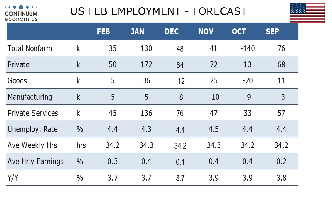 Average hourly earnings trend is around 0.3% per month, though the last four months have seen three gains of 0.41% and one of 0.05%. We expect February to be in line with trend and close to 0.3% even before rounding. That would leave yr/yr growth stable at 3.7%.