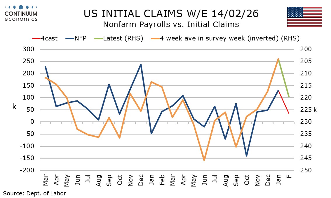 January’s data was supported by strongly positive seasonal adjustments, which turn negative in February. January’s data was also surveyed before some bad weather in late January, which would weigh on February data, though initial claims were back to normal in February’s payroll survey week after a bounce during the cold weather spell. A clearly negative payroll looks unlikely.