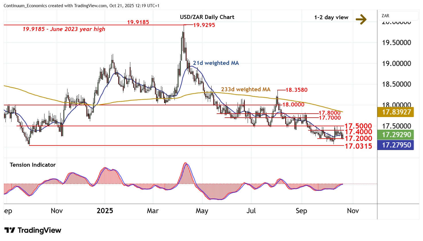 11:55 BST - Cautious trade has given way to a fresh test of congestion support at 17.2000, where unwinding oversold intraday studies are prompting a bounce to 17.2850. Daily readings have turned mixed/negative, highlighting potential for a retest of 17.2000. But rising weekly charts should limit any break in renewed buying interest above critical multi-month support at the 17.0315 year low of 30 September. Meanwhile, resistance remains within 17.4000 - 17.5000. A close above 17.5000 is needed to improve sentiment and extend early-October gains towards further resistance within 17.7000 - 17.8000.
