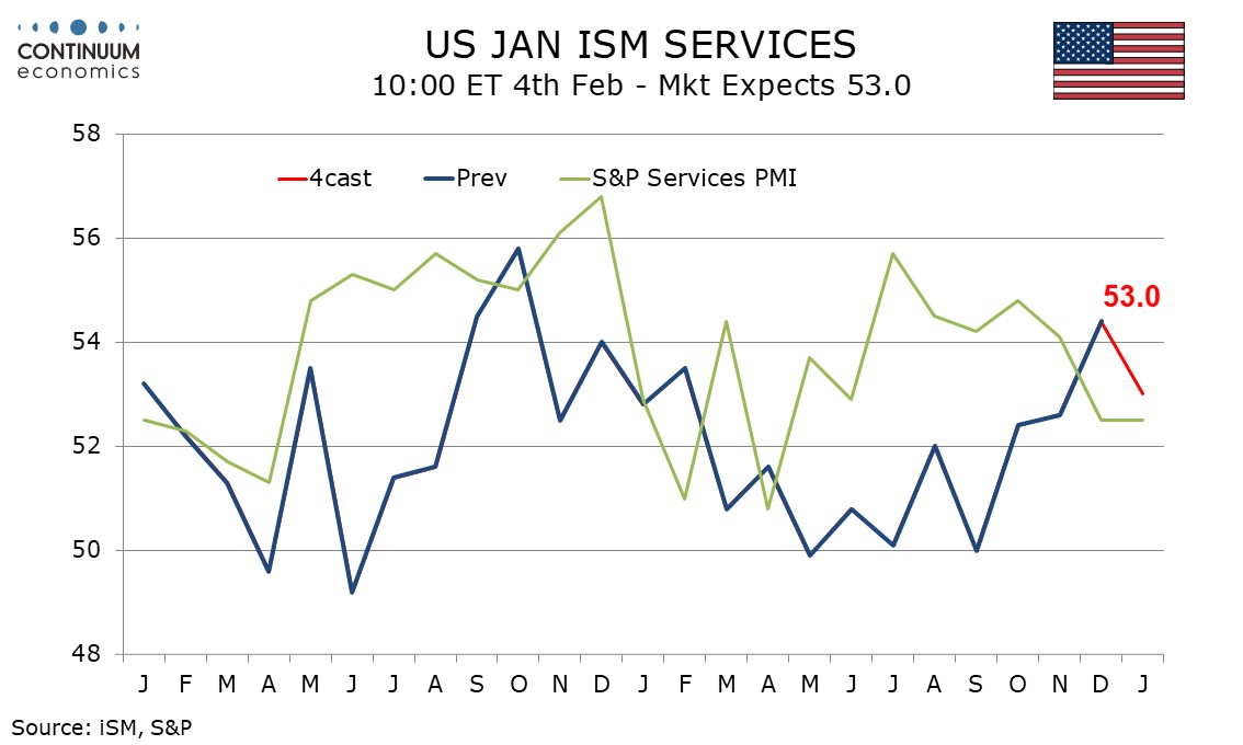 We expect January’s non-farm payroll to rise by 85k overall and by 80k in the private sector, which would be on the firm side of trend and could be even more so after what could be substantial negative historical revisions. However, we expect unemployment to rise to 4.5% from 4.4%. We expect average hourly earnings to rise by 0.3%, in line with recent trend. Initial claims remained low in January’s payroll survey week, suggesting layoffs remain limited too. While signals on hiring are also weak January is a month in which before seasonal adjustment payrolls fall sharply, meaning that a low level of layoffs could be more significant than a low level of hirings in seasonally adjusted data.