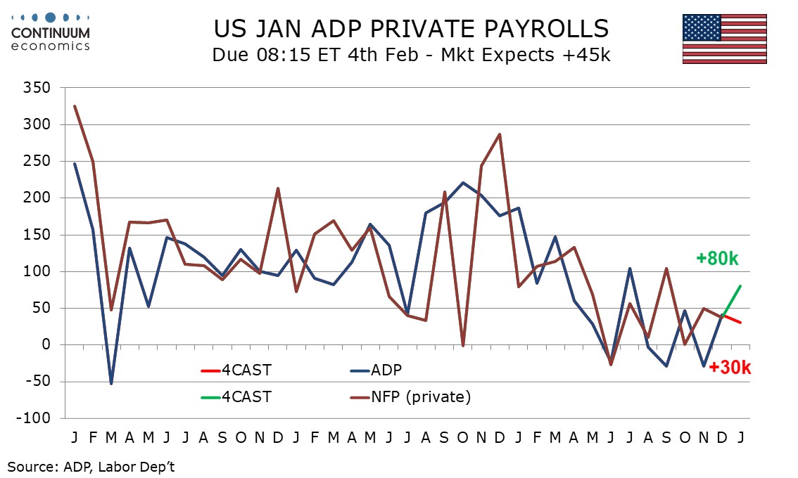 We expect a 30k increase in January’s ADP estimate for private sector employment, which would be a slowing from 41k in December. We expect the ADP report to significantly underperform January’s non-farm payroll, where we expect a rise of 80k in the private sector, and 85k overall. Weekly ADP data, showing an average weekly job increase of 7.75k in the four weeks to January 3 looks to be on a slowing trend, with the four weeks to December 13, December’s payroll survey week, showing an average gain of 10.5k, which was consistent with December’s 41k ADP outcome. The latest weekly data is still two weeks prior to the survey week for January’s monthly data, and low initial claims suggest no further deterioration, while bad weather in late January came after the survey week. However it is likely that January’s ADP data will show a slower rise than December’s.