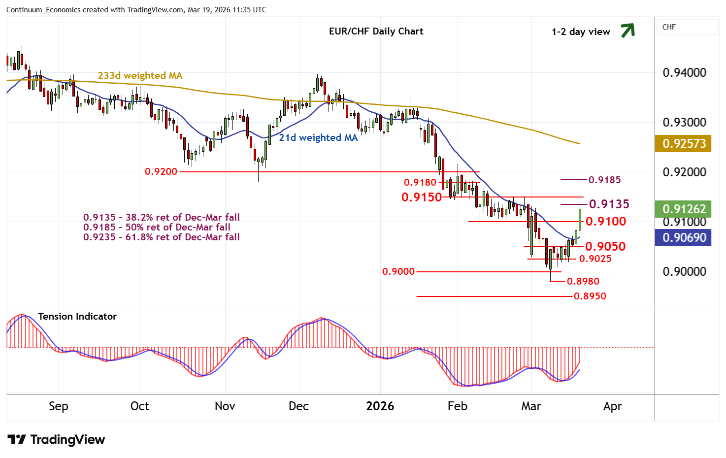 10:55 GMT - Consolidation around 0.9075 has given way to a sharp break higher, with focus turning to resistance at the 0.9135 Fibonacci retracement and the 0.9150 break level. Daily stochastics are flattening in overbought areas, suggesting any immediate tests of this range could give way to consolidation. But the positive daily Tension Indicator and a tick higher in oversold weekly stochastics point to room for a later break and extension of late-January gains towards 0.9180/85. The bearish weekly Tension Indicator and negative longer-term charts could limit any initial tests in profit-taking/consolidation. Meanwhile, support is raised to 0.9100. A close back beneath here would turn sentiment neutral once again and give way to fresh consolidation above 0.9050.