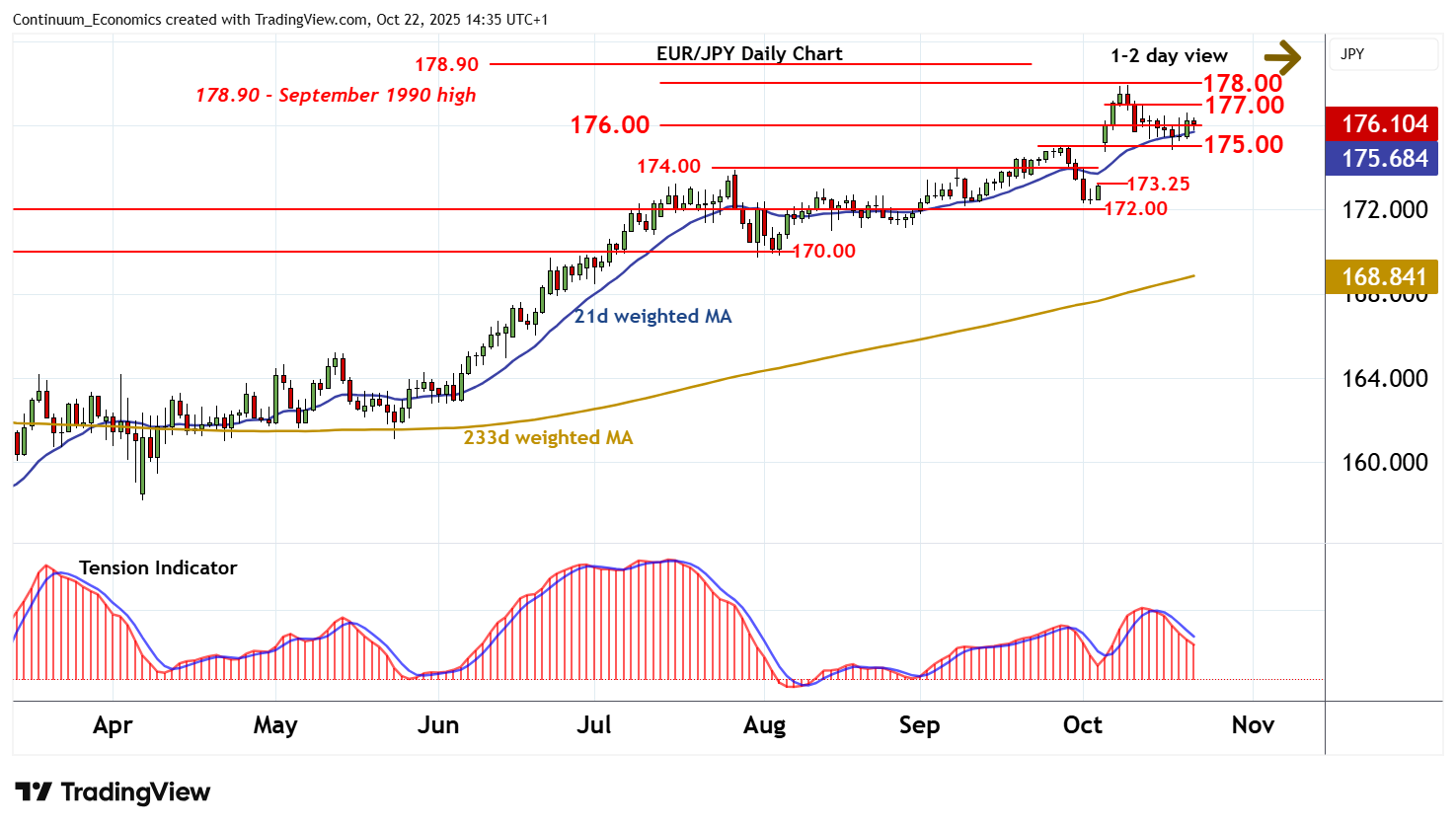 14:20 BST - Little change, as prices extend cautious trade around support at 176.00. Daily stochastics are marginally positive, suggesting room for a test higher. But the negative daily Tension Indicator and mixed weekly charts should limit scope in renewed consolidation beneath resistance at 177.00. Meanwhile, a close below 176.00 would put prices back into consolidation above congestion support at 175.00.