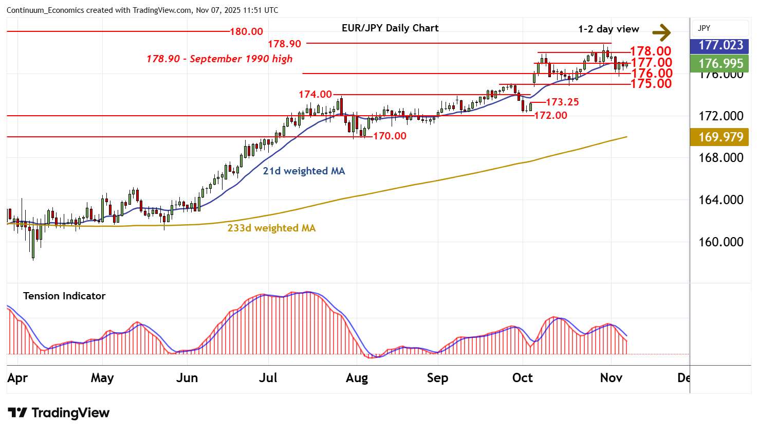 11:50 GMT - Still little change, as mixed intraday studies keep near-term sentiment cautious and extend consolidation around resistance at 177.00. Daily readings continue to fall, highlighting potential for a pullback. But mixed weekly charts should are expected to limit scope in renewed buying interest/consolidation towards support at 176.00. A close beneath here, however, will add weight to sentiment and open up a test of congestion support at 175.00. Meanwhile, any immediate tests above 177.00 should give way to consolidation beneath 178.00.
