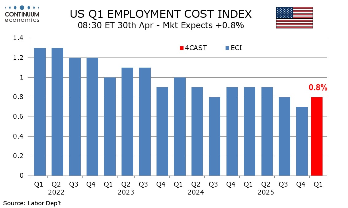 We look for the Q1 employment cost index (ECI) to increase by 0.8%, slightly firmer than the 0.7% seen in Q4 that was the slowest since Q2 2021 but still seeing the yr/yr pace slow to 3.2% from 3.4%, reaching its slowest since Q2 2021.