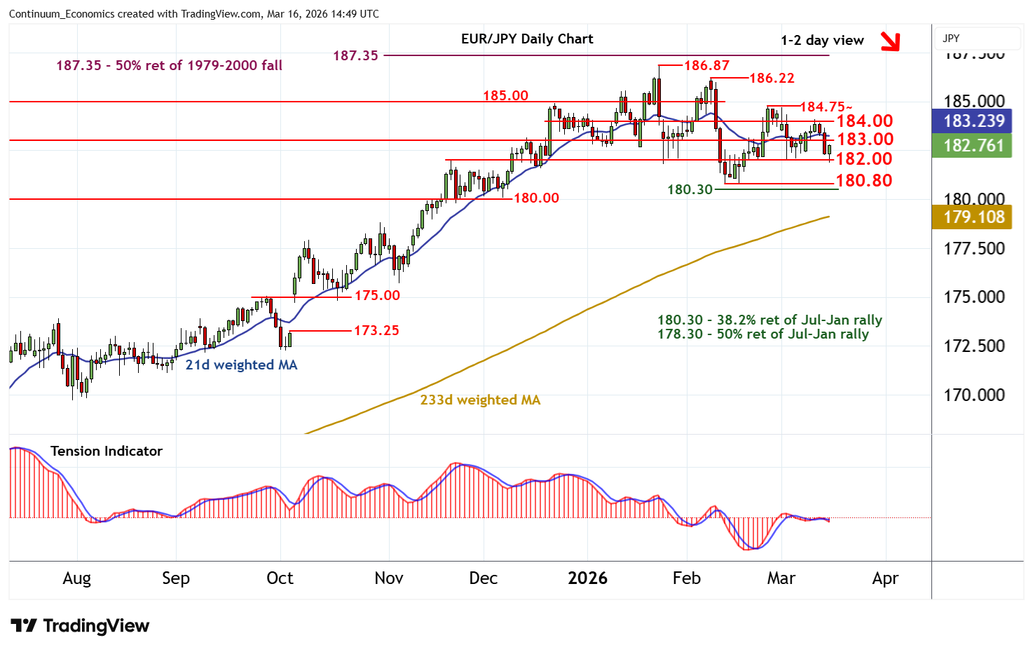 14:35 GMT - Little change, as prices extend cautious trade within the 182.00 - 183.00 range. Rising intraday studies are prompting a minor bounce towards resistance at the 183.00 break level. But negative daily and weekly readings should limit any break in renewed selling interest beneath congestion around 184.00. Following cautious trade, fresh losses are looked for. Support is at congestion around 182.00. But a close below the 180.80/00 range is needed to turn sentiment negative and confirm continuation of late-January losses.