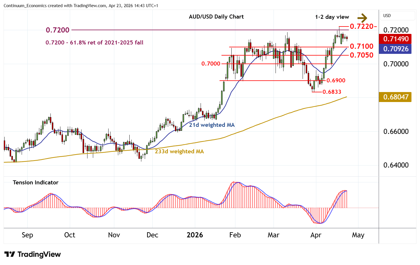 14:35 BST - Still little change, as prices extend consolidation around 0.7150. Overbought daily stochastics are turning down and the positive daily Tension Indicator is flattening, suggesting room for a move lower towards congestion support at 0.7100. But mixed/positive weekly readings should limit any deeper losses in renewed buying interest above further congestion around 0.7050. Meanwhile, strong resistance remains at the 0.7200 Fibonacci retracement and extends to the 0.7220~ current year high of 17 April. A close above here is needed to turn sentiment positive once again and extend April 2025 gains towards the 0.7280~ high of June 2022.