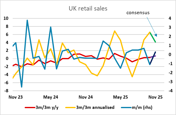 A busy week for UK data and events concludes with the November retail sales data. This is an important month, only second to December in the (non-seasonally adjusted) level of sales. After a sharp 1.1% drop in October the market consensus is anticipating a modest 0.3% increase in November, which would be enough to sustain the mildly positive underlying trend, as the October decline followed four months of solid increases. GBP reacted positively to the BoE rate cut on Thursday, with the 5-4 vote and the indication that the Bank believed that “most labour market data do not suggest a rapid opening of slack” preventing any increase in market expectations of easing, despite a downward revision to the Bank’s forecast for Q4 GDP. Nevertheless we do see this week’s labour market data and last week’s GDP data as significant evidence of slowdown, and expect there will be more easing in 2026 than the market is pricing in. But it would take a significant decline in retail sales to suggest the trend is deteriorating, so we doubt there will be much GBP reaction. Longer term we still see trend GBP weakness, but we are likely to end the year with EUR/GBP in the mid-0.87s.