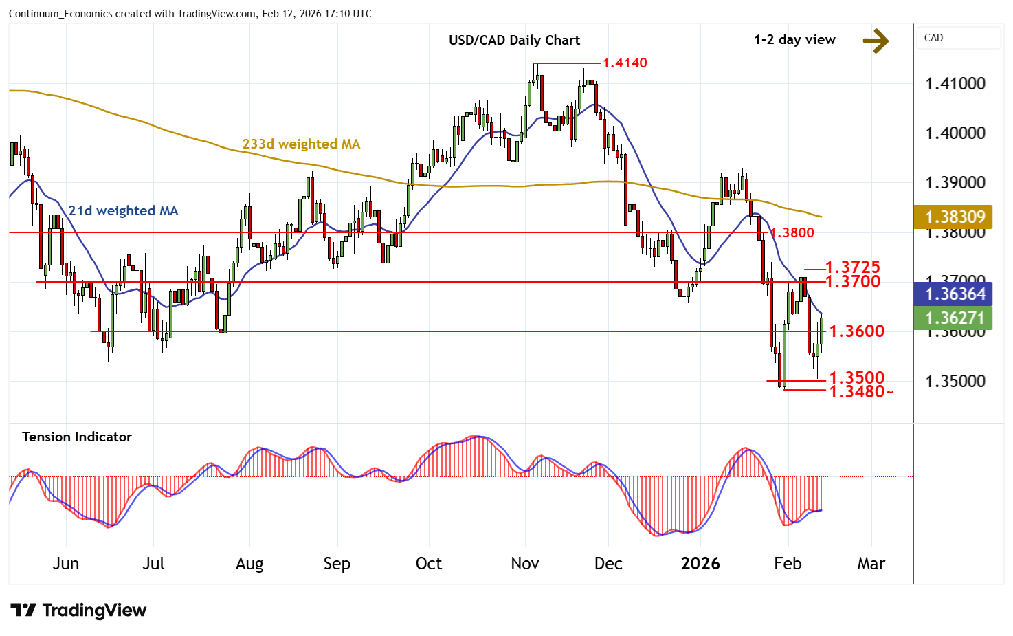 16:50 GMT - The anticipated test of 1.3600 is extending, as intraday studies continue to rise, with prices currently trading around 1.3630. Flat daily stochastics have ticked higher and the daily Tension Indicator continues to rise, highlighting room for continuation towards congestion resistance at 1.3700. Just higher is the 1.3725 weekly high of 5 February. But negative weekly charts should limit any immediate tests of this 1.3700/25 range in consolidation/profit-taking. Following cautious/choppy trade, fresh losses are looked for. A close below the 1.3480~ current year low of 30 January will add weight to sentiment and extend February 2025 losses below the 1.3480~ current year low of 30 January towards the 1.3420 low of September 2024.