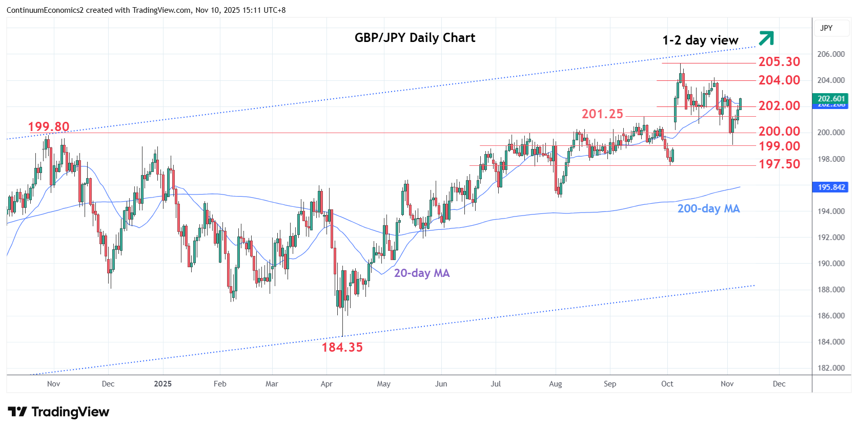 07:45 GMT - Sharply higher as prices extend rally from the 199.00 low of last week through the 202.00 level. Nearby see room to the 203.00/25 area then the strong resistance at 204.00 congestion. Clearance here will set up scope for retest of the 205.30, 8 October YTD high. Beyond this will see room for extension to 206.00 level. Meanwhile, support is raised to 201.25/200.00 September high and congestion area which should now underpin. Below this will expose 199.00 low to retest and threaten deeper pullback to retrace the April/October rally.