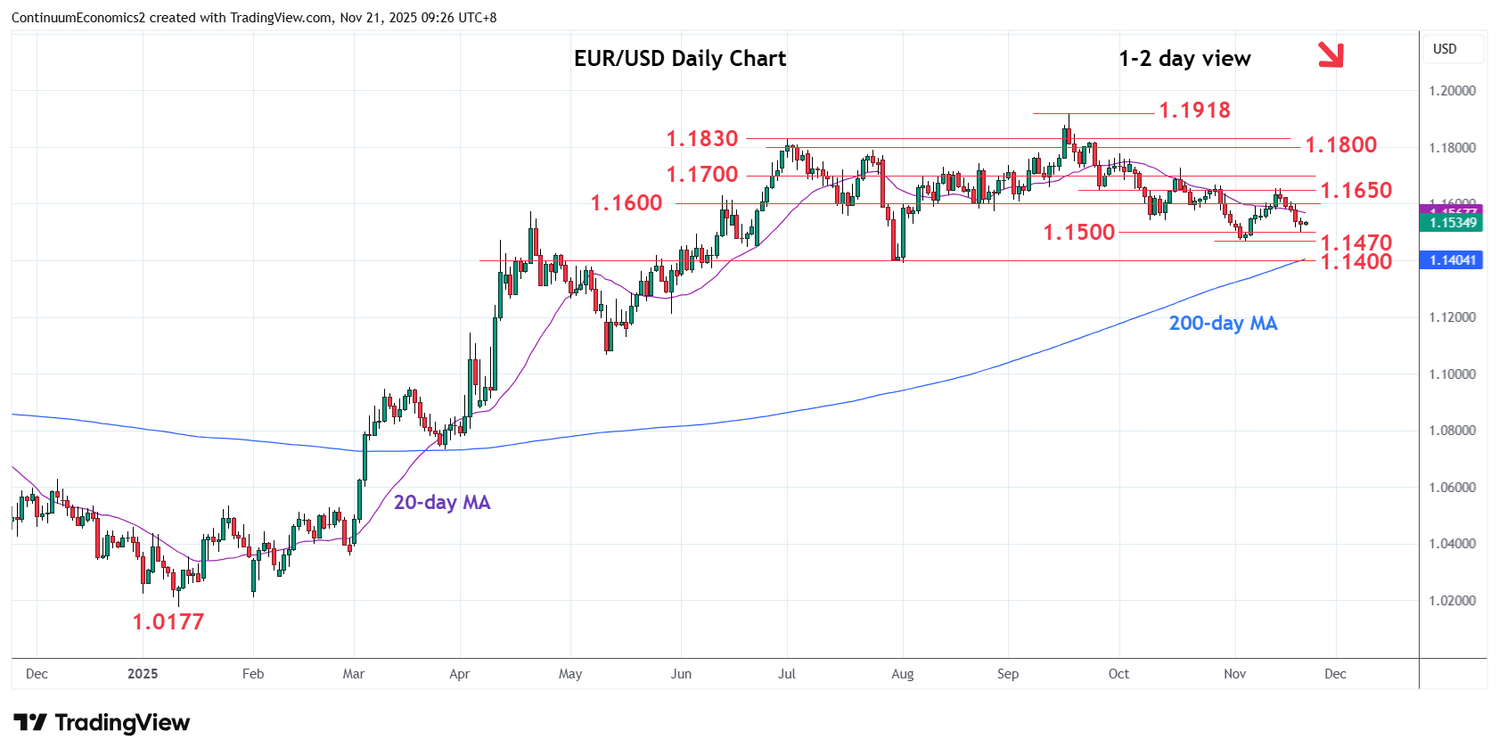 01:30 GMT - Consolidating test of the 1.1500 level as prices unwind oversold intraday studies and bearish momentum slows. However, the downside remains vulnerable and break here will see room to retest the 1.1470 low. Would expect reaction here but break cannot be ruled out to extend the losses from 1.1918, September current year high. Meanwhile, resistance at the 1.1550/1.1600 congestion area now expected to cap. Only above here will ease the downside pressure and see room for stronger bounce to retest the 1.1650 swing high.