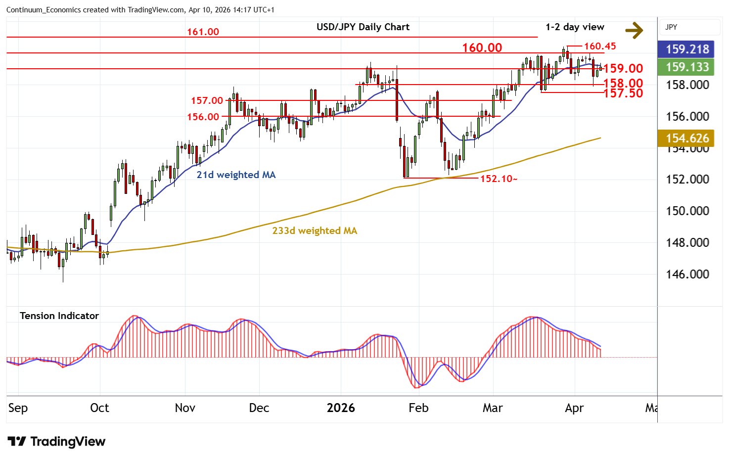 14:05 BST - Little change, as the anticipated test above 159.00 gives way to choppy trade just above here. Beyond here is congestion around 160.00. But negative daily readings and mixed/negative weekly charts should prompt renewed selling interest into any extension towards here. Following cautious/corrective trade, fresh losses are looked for. Support remains at 158.00. But a close below the 157.50 weekly low of 19 March will add weight to sentiment and confirm a near-term top in place at the 160.45 current year high of 30 March, as focus then turns to the 157.35 Fibonacci retracement. Beneath here is congestion around 157.00.