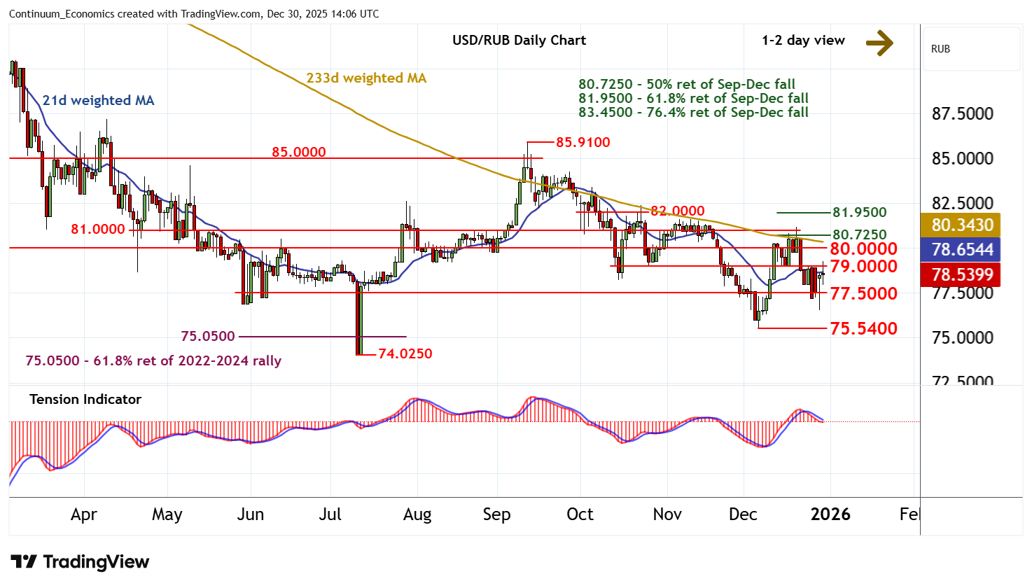 13:40 GMT - Little change, as prices extend cautious trade within the 77.5000 - 79.0000 range. Negative daily studies are showing signs of flattening and broader weekly charts are rising, suggesting room for a later break above 79.0000. Focus will then turn to congestion around 80.0000. But bearish longer-term readings are expected to limit any immediate break beyond here in selling interest/consolidation beneath the 80.7250 Fibonacci retracement. Meanwhile, any immediate tests below congestion support at 77.5000 should be limited in consolidation above the 75.5400 weekly low of 5 December.