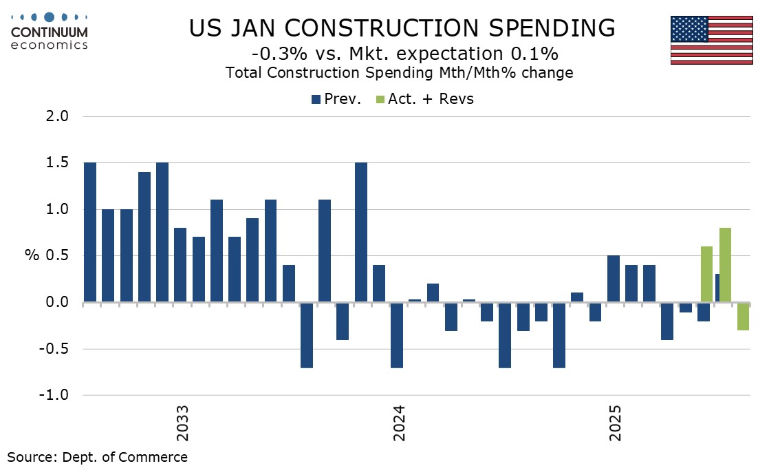 January construction spending at -0.3% is weaker than expected but more than fully offset by upward revisions to December, to a 0.8% increase from 0.3%, and November, to a 0.6% increase from -0.2%.